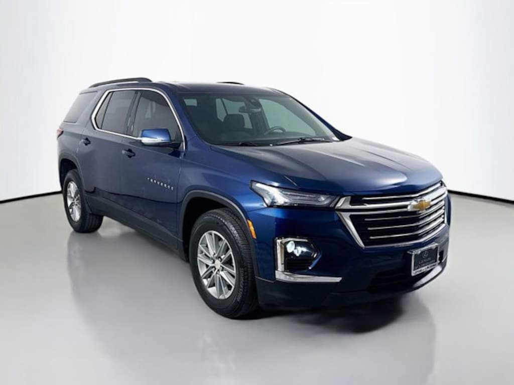 2023 Chevrolet Traverse LT 1LT Clean CARFAX. CARFAX One-Owner. 2-Way Manual Front Passenger Seat Adjuster, 3.49 Axle Ratio, 3rd row seats: split-bench, 4-Wheel Disc Brakes, 4.2 Multi-Color Enhanced Driver Instrument Display, 6 Speakers, 6-Speaker Audio System Feature, 8-Passenger Seating (2-3-3 Seating Configuration), 8-Way Power Driver Seat Adjuster, ABS brakes, Air Conditioning, Alloy wheels, AM/FM radio: SiriusXM, Apple CarPlay/Android Auto, Auto High-beam Headlights, Automatic temperature control, Black Roof Rails, Brake assist, Bumpers: body-color, Compass, Convenience & Driver Confidence Package, Delay-off headlights, Driver door bin, Driver vanity mirror, Dual front impact airbags, Dual front side impact airbags, Electronic Stability Control, Emergency communication system, Exterior Parking Camera Rear, Four wheel independent suspension, Front anti-roll bar, Front Bucket Seats, Front Center Armrest, Front dual zone A/C, Front License Plate Bracket Mounting Package, Front reading lights, Fully automatic headlights, Heated door mirrors, Heated Driver & Front Passenger Seats, Illuminated entry, Leather steering wheel, Low tire pressure warning, Not Equipped w/Rear Park Assist (060), Occupant sensing airbag, Outside temperature display, Overhead airbag, Overhead console, Panic alarm, Passenger door bin, Passenger vanity mirror, Power door mirrors, Power Driver Lumbar Control, Power driver seat, Power steering, Power windows, Preferred Equipment Group 1LT, Premium Cloth Seat Trim, Radio data system, Radio: Chevrolet Infotainment 3 Plus System, Radio: Chevrolet Infotainment System AM/FM Stereo, Rear air conditioning, Rear anti-roll bar, Rear Power Liftgate, Rear reading lights, Rear window defroster, Rear window wiper, Remote keyless entry, Remote Start, Security system, SiriusXM Radio, SiriusXM w/360L, Speed control, Speed-sensing steering, Spoiler, Steering wheel mounted audio controls, Tachometer, Telescoping steering wheel, Tilt steering wheel, Traction control, Trip computer, Turn signal indicator mirrors, Universal Home Remote, Variably intermittent wipers, Voltmeter, Wheels: 18 Bright Silver-Painted Aluminum. Northsky Blue Metallic 2023 Chevrolet Traverse LT 1LT FWD 9-Speed Automatic 3.6L V6 SIDI VVT